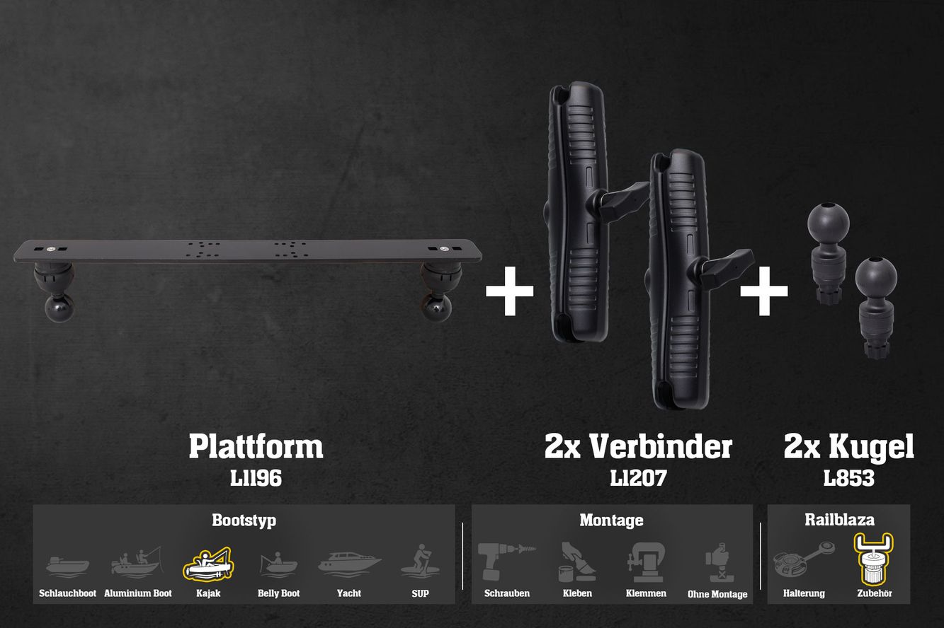 Set: Railblaza Kajak Plattform (560x52mm)+ 2x Verbinder + 2x 1,5 Zoll Kugeln Echolot