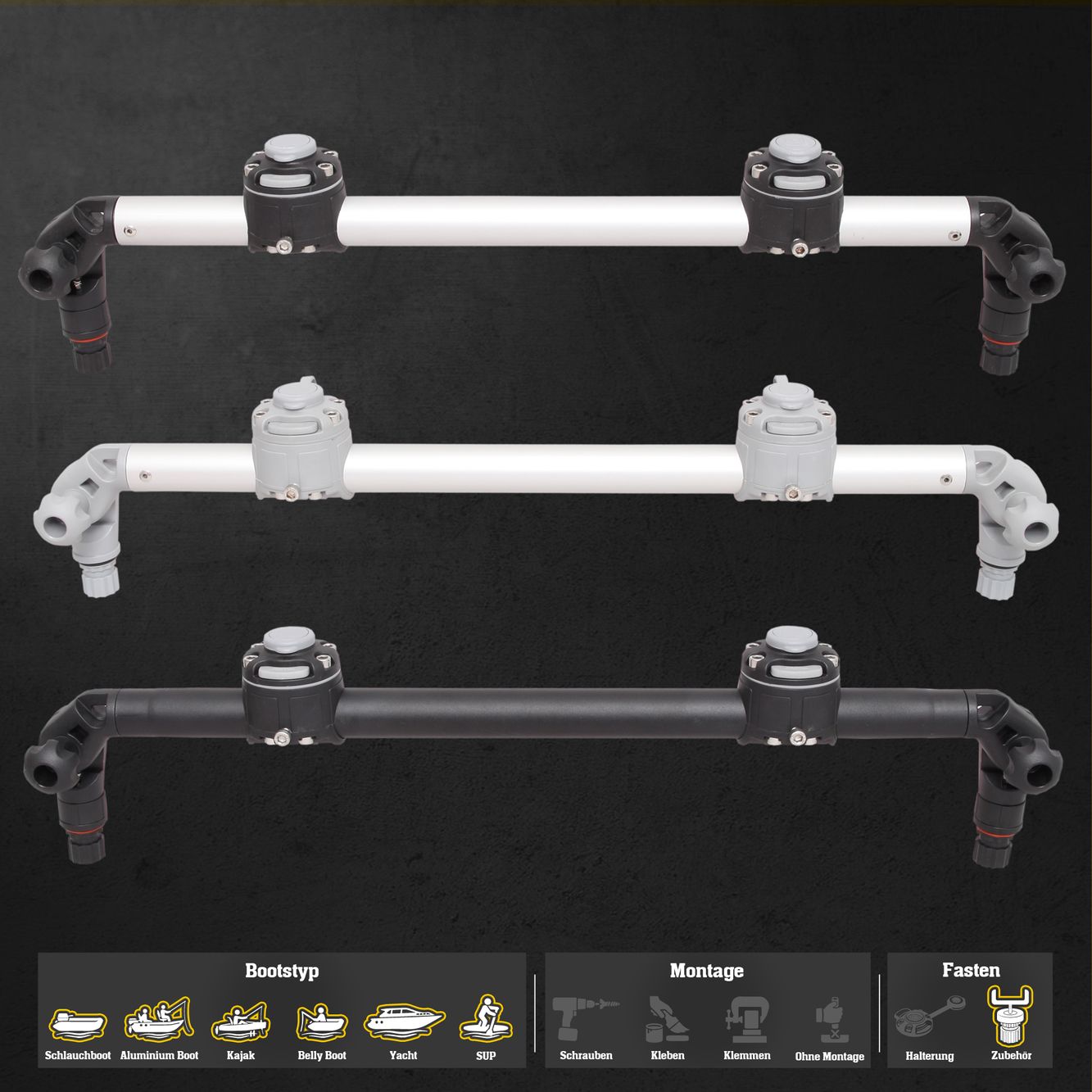 Die Stange ist aus beschichteter Aluminiumlegierung und ist mit ihrer Länge von 610 mm lang genug, um gleichzeitig bis zu 6 Halterungen anzubringen. Da die Mehrsteckleiste 2 außen platzierte, nicht verstellbare Befestigungspunkte hat, sind die an ihr angebrachten Halterungen für mittlere bis höhere Belastungen geeignet und sind somit besser für z. B. Ruten-, Anker- oder Seilhalter geeignet als die Gm350-3. Mit diesem Zubehör kannst Du dein Boot mit einer kleinen Reling nachrüsten und dann alle Vorteile einer Reling genießen.