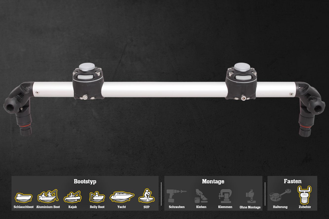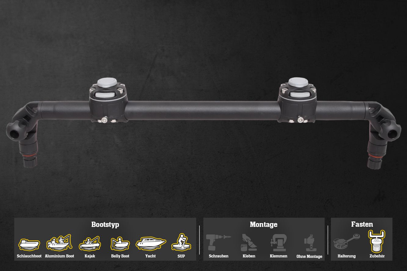 Wie oft hast Du dir schon gewünscht, in zwei Halterungen mehr als zwei Fasten-Zubehörartikel befestigen zu können? Nun gehört dieses Problem der Vergangenheit an. Mit der Gr610-2 kannst Du selber entscheiden, wieviele Halterungen Du gleichzeitig haben möchtest ohne weitere Halterungen montieren zu müssen. Ob zwei, drei, vier oder fünf Halterungen her müssen - die Wahl liegt allein bei Dir. Vereinfacht gesagt, wenn Du bereits 2 Halterungen an deinem Boot hast, kannst Du dieses Zubehör dort befestigen und somit aus 2 Halterungen mehrere Halterungen machen.