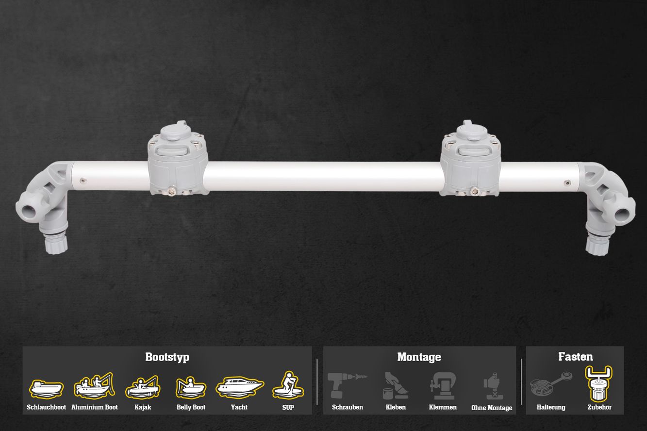 • Befestigungspunkte nicht verstellbar. Das bedeutet, der Abstand zwischen den Halterungen am Boot muss 610 mm betragen.