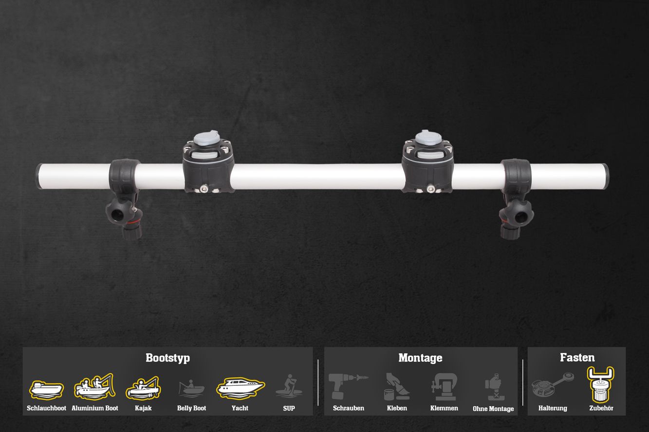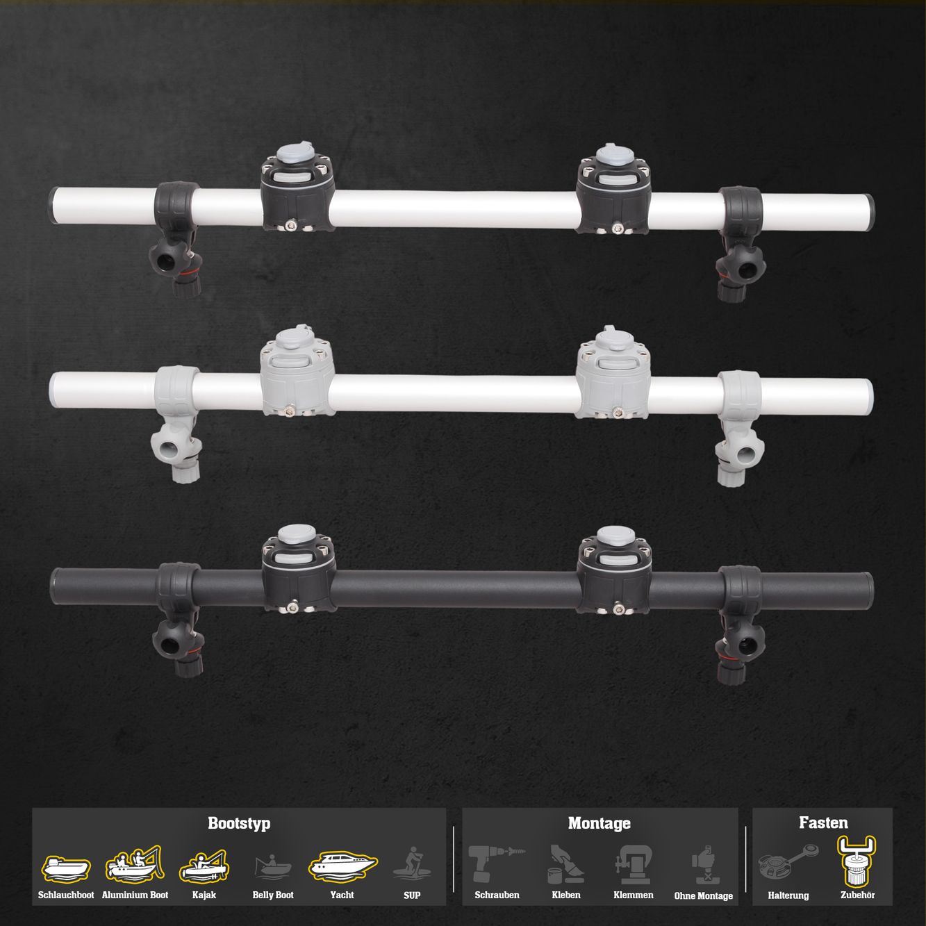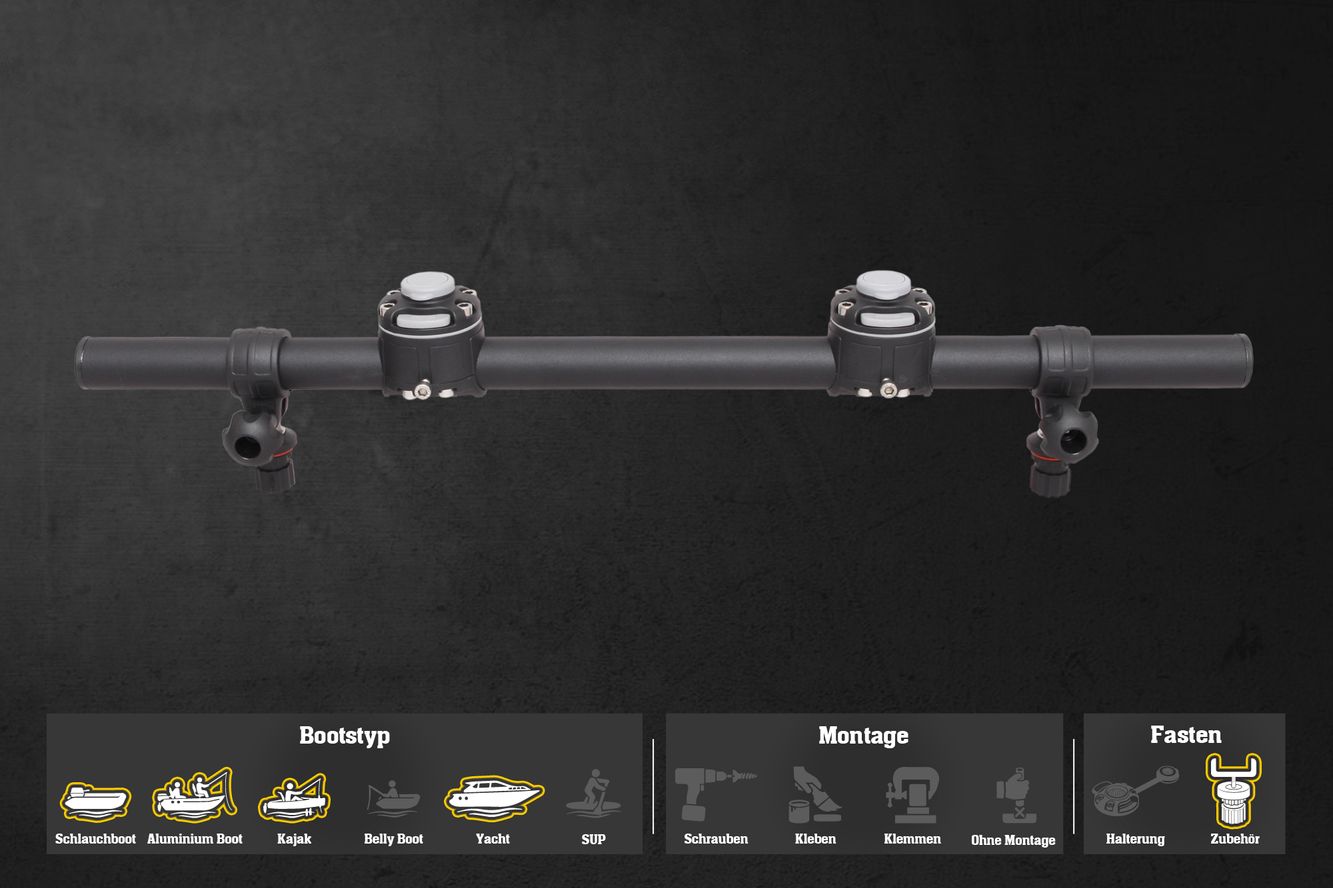 • verstellbare Befestigungspunkte: Dadurch ist der Abstand zwischen den 2 Halterungen, die am Boot montiert sind, irrelevant.