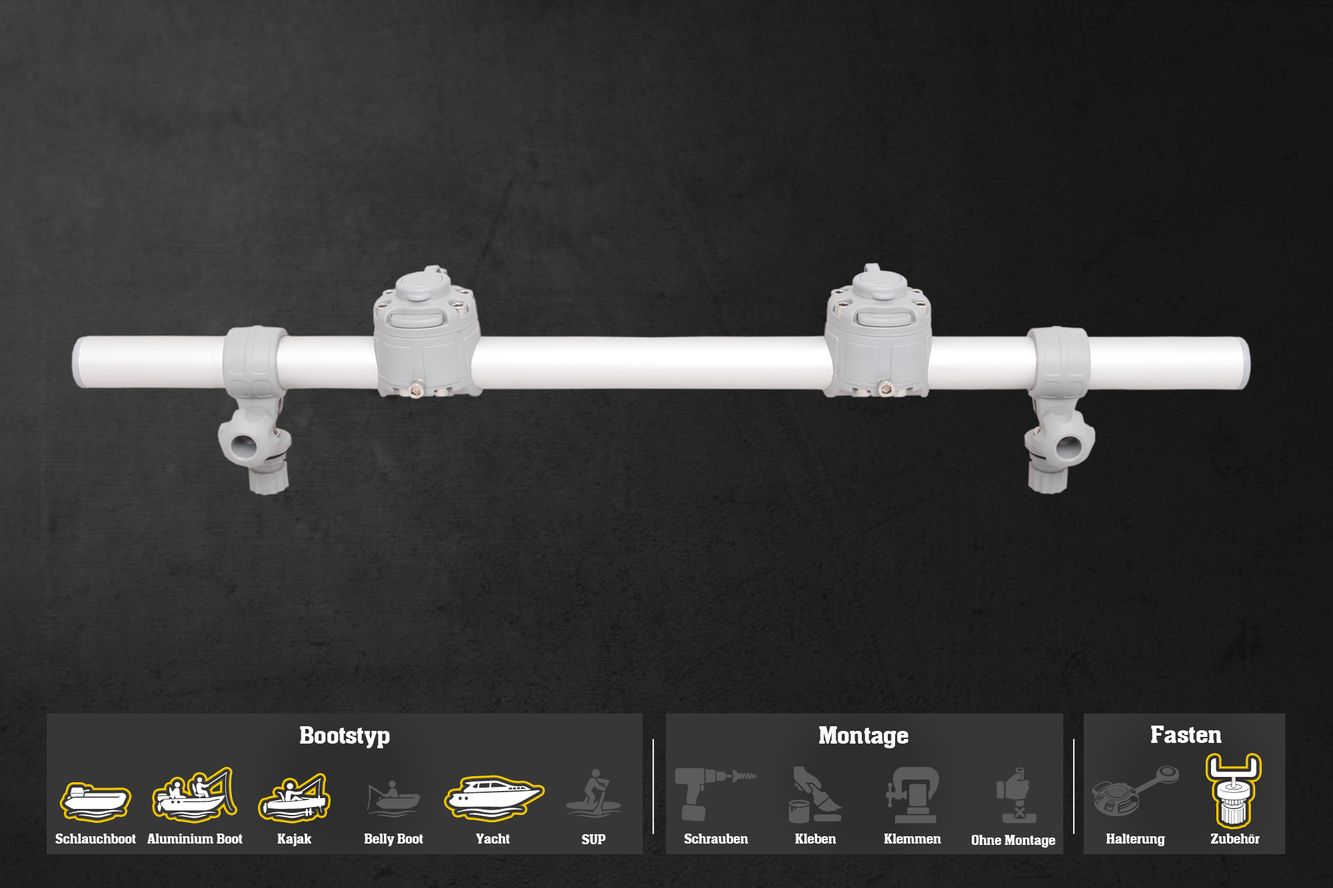 kannst Du selber entscheiden, wieviele Halterungen Du gleichzeitig haben möchtest ohne weitere Halterungen montieren zu müssen. Ob zwei, drei, vier oder fünf Halterungen her müssen - die Wahl liegt allein bei Dir. Vereinfacht gesagt, wenn Du bereits 2 Halterungen an deinem Boot hast, kannst Du dieses Zubehör dort befestigen und somit aus 2 Halterungen mehrere Halterungen machen.