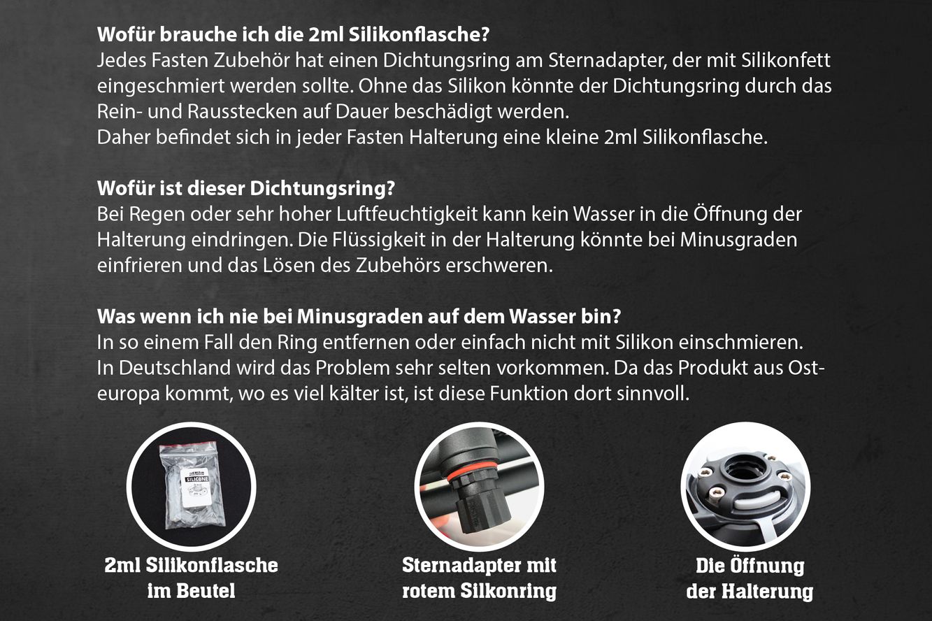 Es ist wichtig, dass Du den Befestigungsring mit Silikonfett einschmierst. Das mitgelieferte Silikon ist für die Schmierung der beweglichen Teile und des Dichtungsrings vorgesehen und verhindert die Bildung eines Wasserfilms, welcher einfrieren könnte, was selbst bei niedrigen Temperaturen die Funktionsweise der Halterungen nicht beeinträchtigt.