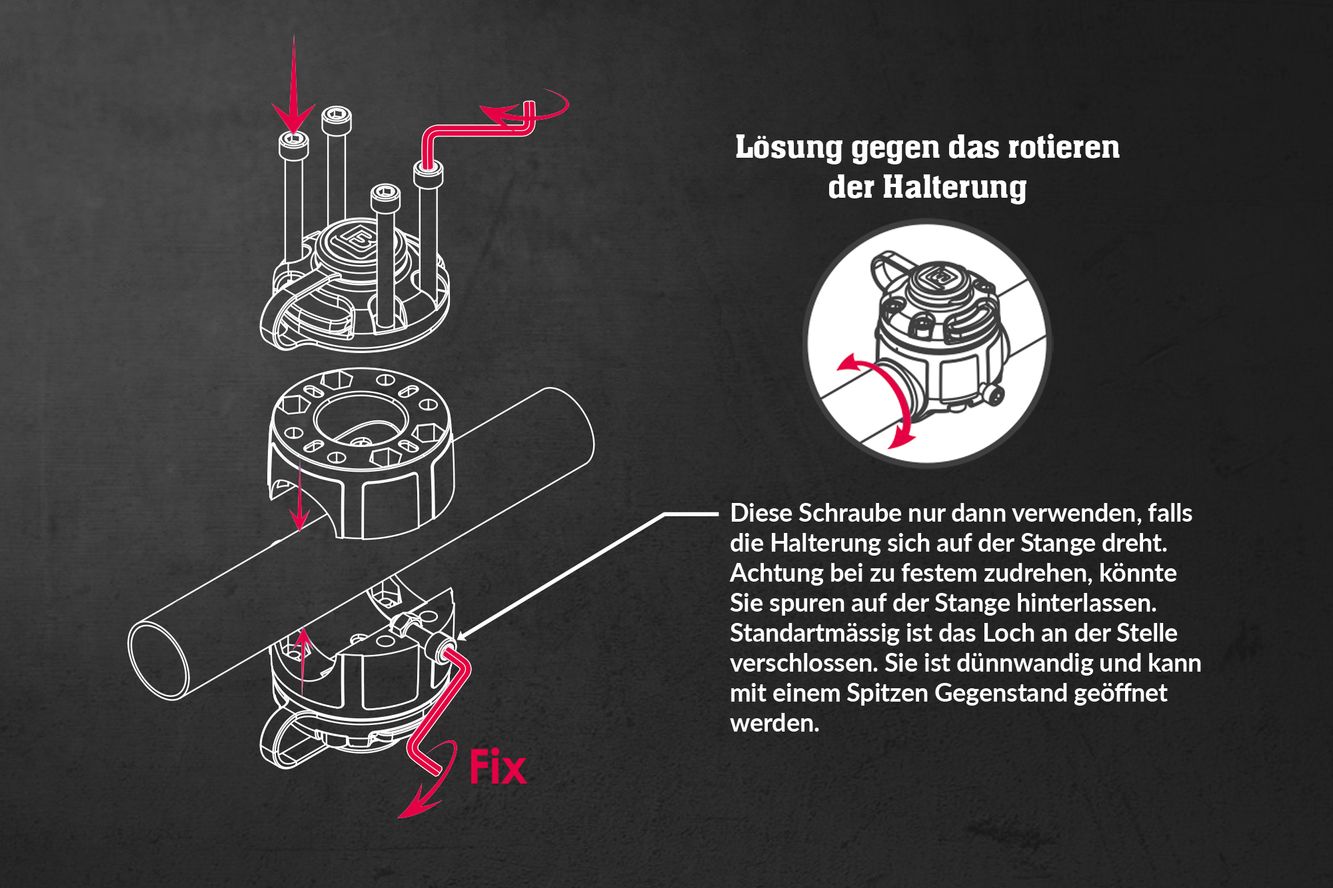 • die Halterungen sind um die Stange um 360° rotierbar; einfach in der gewünschten Position die Schrauben festziehen