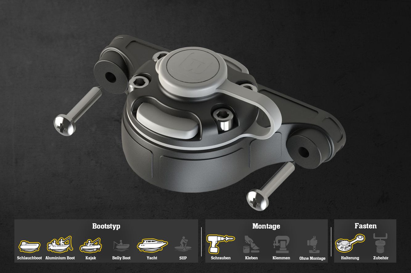 Die Halterung wurde speziell für die horizontale Montage an senkrechten Flächen deines Bootes entwickelt. Sie lässt sich mit den mitgelieferten selbstziehenden Schrauben mühelos auf Holz befestigen. Zudem kann sie auf stabilen Oberflächen wie Aluminium oder GFK-Booten sicher verschraubt werden. Bei Schlauchbooten wird sie häufig am Heckspiegel montiert.