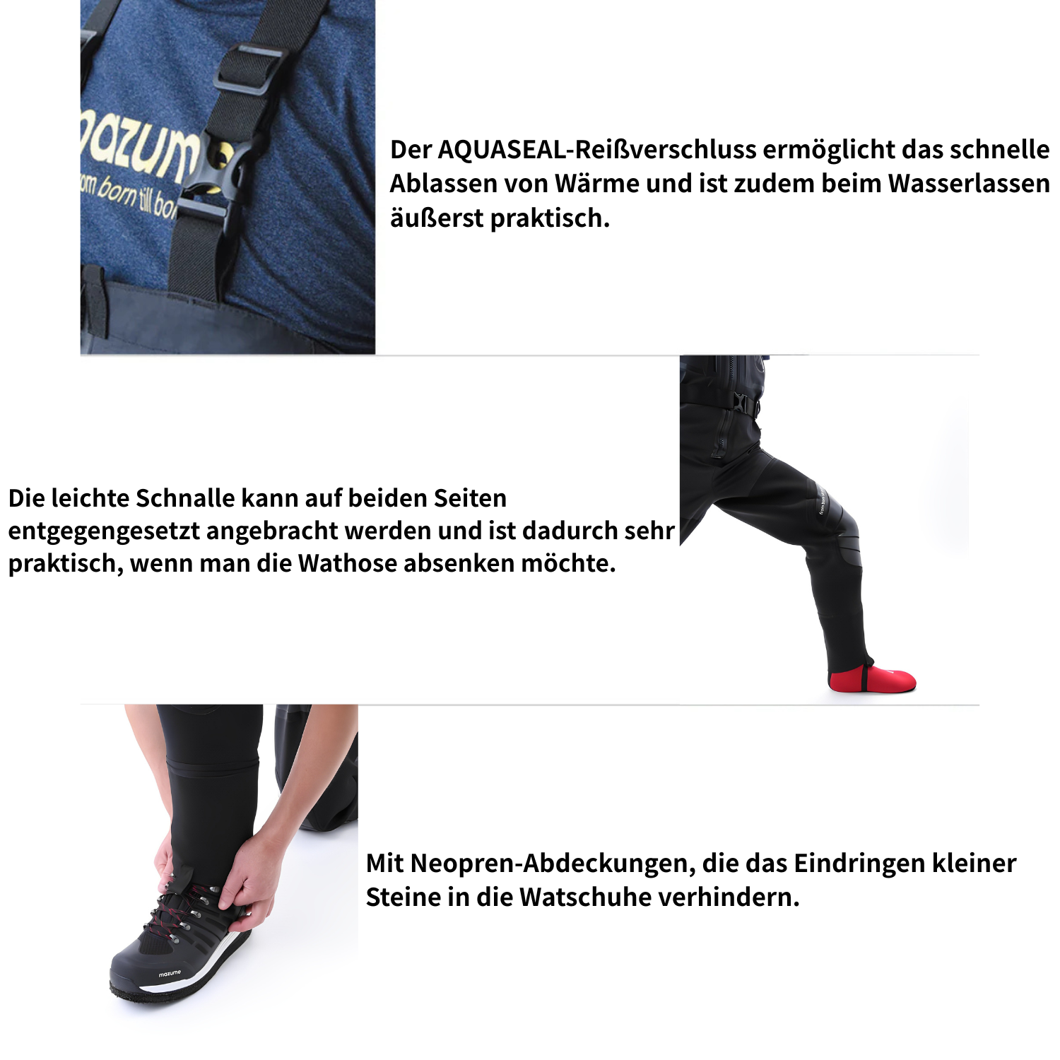 In addition, the large opening with waterproof YKK Aqua Seal zipper makes it easy to put on and take off. Even an urgent need can be dealt with quickly and easily with these waders.